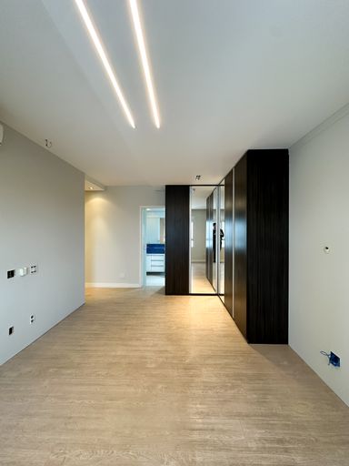 Projeto de interiores sofisticado, com móveis planejados e iluminação em LED