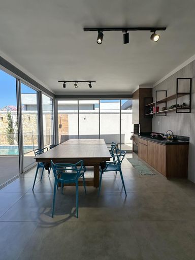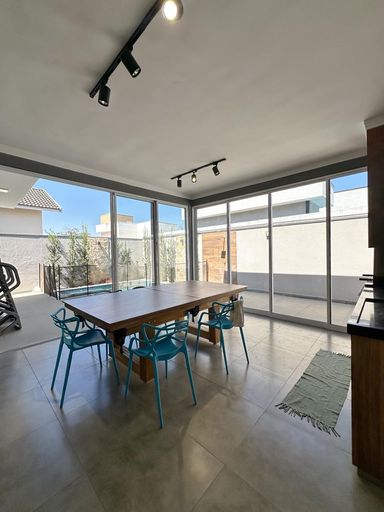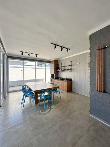 Área gourmet envidraçada com churrasqueira, planejados, lavabo, mesa de jantar/sinuca e cadeiras