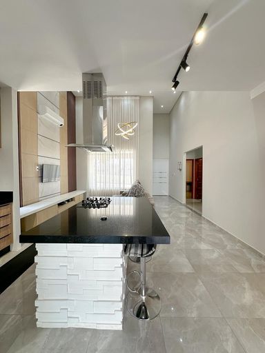 Cozinha integrada com planejados e eletrodomésticos (geladeira, cooktop, forno e coifa)