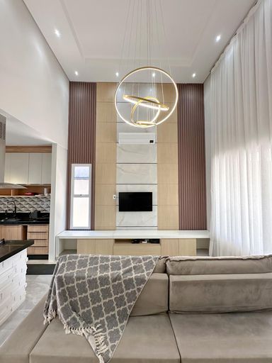 Sala ampla com pé direito duplo, planejados e ar-condicionado