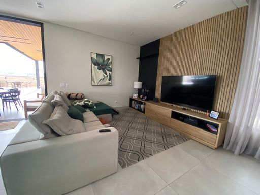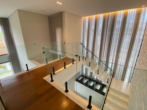 Pavimento superior, possui 3 suítes amplas, sendo uma master com espaço de closet, e banheiro com banheira e uma sala de Tv íntima ou dormitório convencional com ampla sacada.