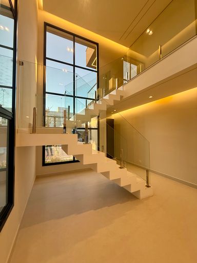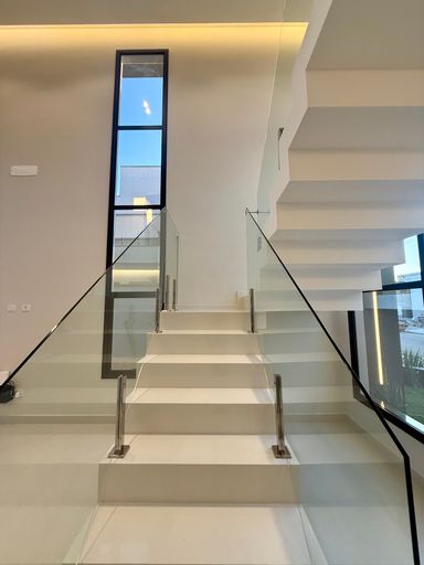 Cozinha em quartzo branco e escada em Branco Prime